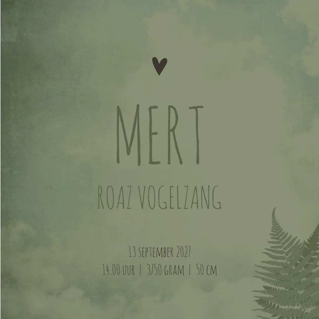 Kaartje Mert is een groen kaartje met gewolkte achtergrond. Wil je graag een andere kleur? Neem dan snel een kijkje in onze editor voor alle opties!