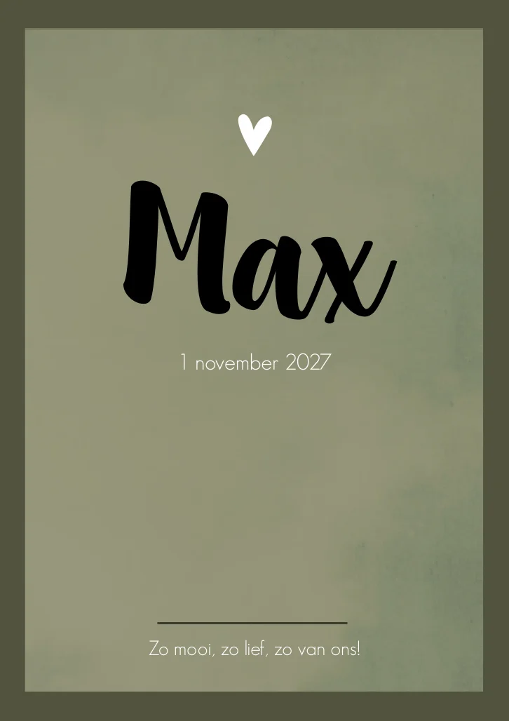 Een klassiek en stoer geboortekaartje. Kaartje Max is een groen gewolkt kader met een donkergroen kader. Door het gebruik van het klassieke lettertype is het een tijdloos ontwerp.