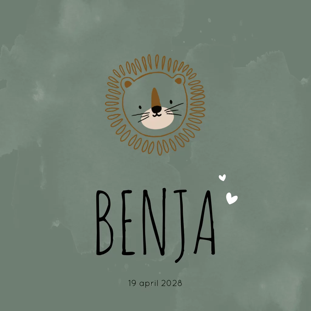 Een lief geboortekaartje met een illustratie van een leeuwtje. Op kaartje Benja is gebruik gemaakt van een donkergroene kleur met witte vlekken voor een stoer effect. Een perfecte combi tussen lief en stoer!