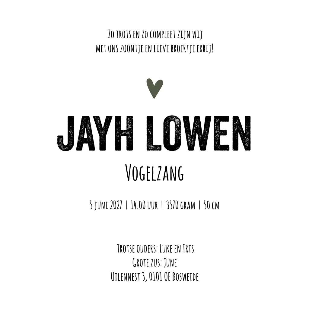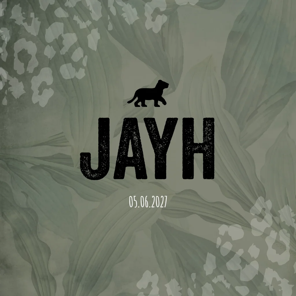 Een stoer groen Savanne geboortekaartje met een panterprint en een illustratie van een leeuwtje. Kaartje Jayh is extra stoer door het zwarte lettertype. Wil je de kaart graag anders zien? Pas het dan gemakkelijk zelf aan in onze editor!