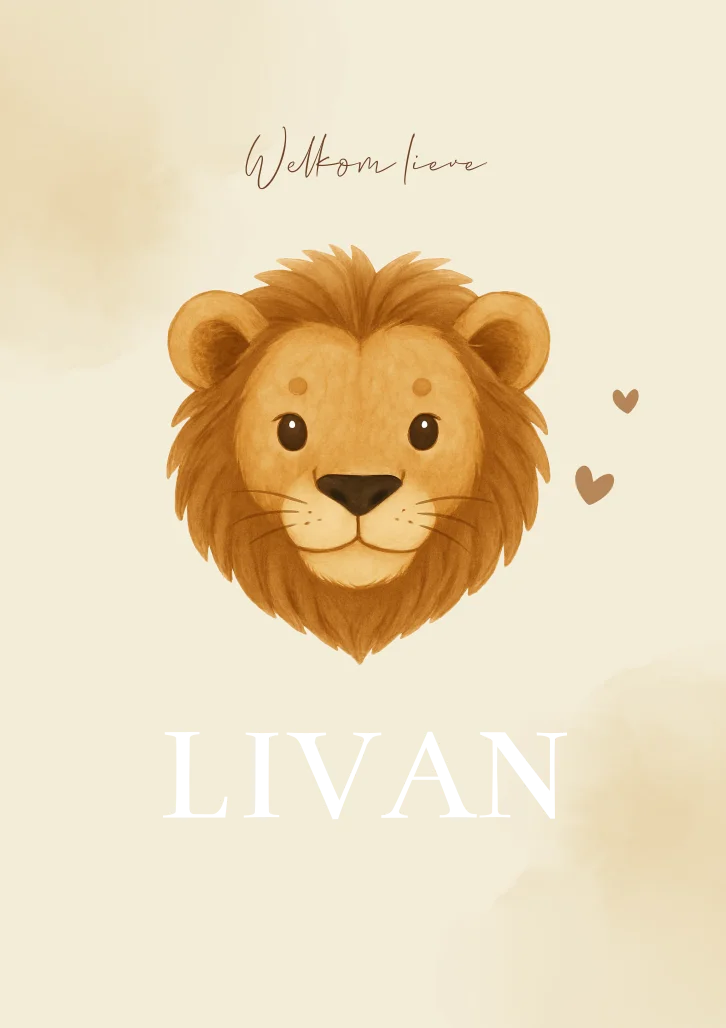 Een trendy en hip geboortekaartje met een Leeuwenkop. De kaart is in een beige en bruine kleur. Maak de kaart extra bijzonder met goudfolie of koperfolie. Je kunt de illustratie ook aanpassen naar je eigen wensen. De kop van de leeuw kun je ook aanpassen naar een ander dier. Bekijk de beeldbank voor heel veel (waterverf) tekeningen.