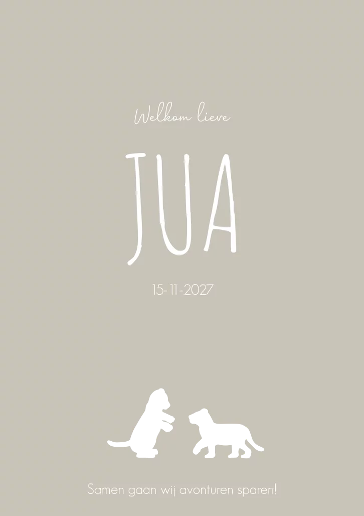 Een beige/grijs geboortekaartje met twee spelende leeuwen welpjes. Een perfect kaartje voor als er een klein broertje op komst is! Kaartje Jua is extra mooi met goudfolie.