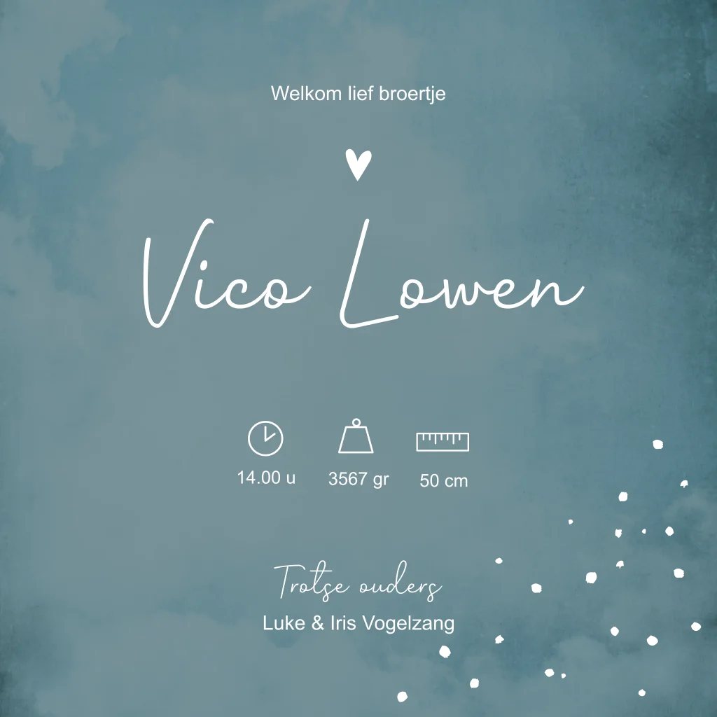 Romantisch lichtblauw geboortekaartje met een hartje en stipjes. De gouden elementen op geboortekaartje Vico zijn ontzettend mooi in combinatie met de blauwe achtergrond. Laat de elementen er uit springen door ze te bedrukken met goudfolie.