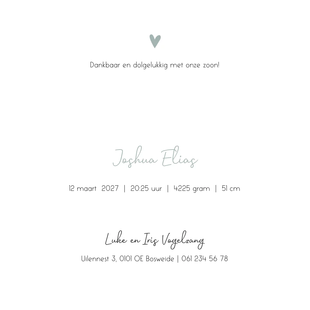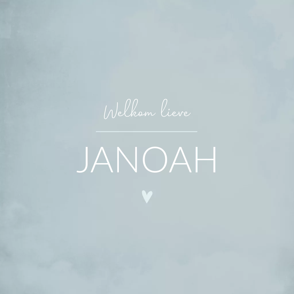 Lichtblauw gewolkt geboortekaartje Janoah met koperen letters en een lichtblauw hartje. Laat dit kaartje bedrukken met koperfolie voor een extra mooi effect. Heb je dit kaartje liever in een ander kleur? Dat kan! Bewerk het geboortekaartje naar eigen wens in de editor.