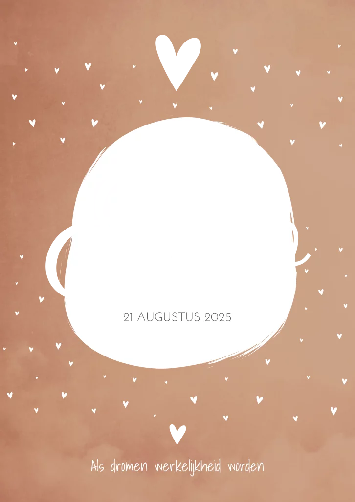 Een lief geboortekaartje met een roestkleurig wolken achtergrond en heel veel hartjes. Pas kaartje Elio gemakkelijk naar eigen wens aan in de editor.