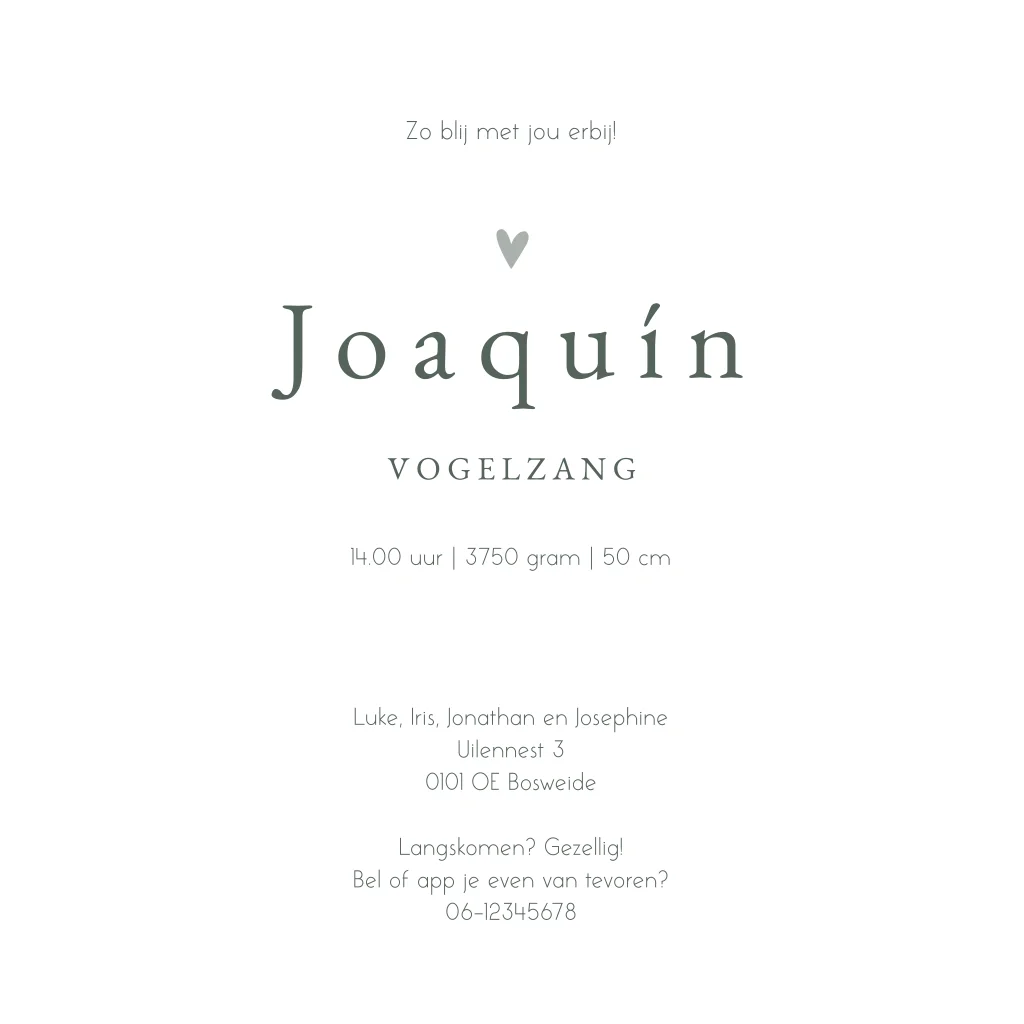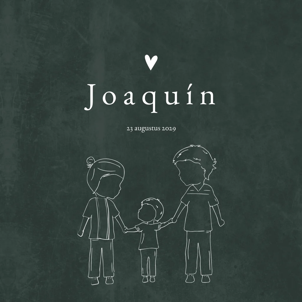 Een stoer donkergroen geboortekaartje met een lijntekening van 2 broertjes en een zusje. Kaartje Joaquín is een simplistisch maar lief kaartje. Heb je een andere gezinssituatie? Pas de illustratie dan gemakkelijk zelf aan in onze editor.