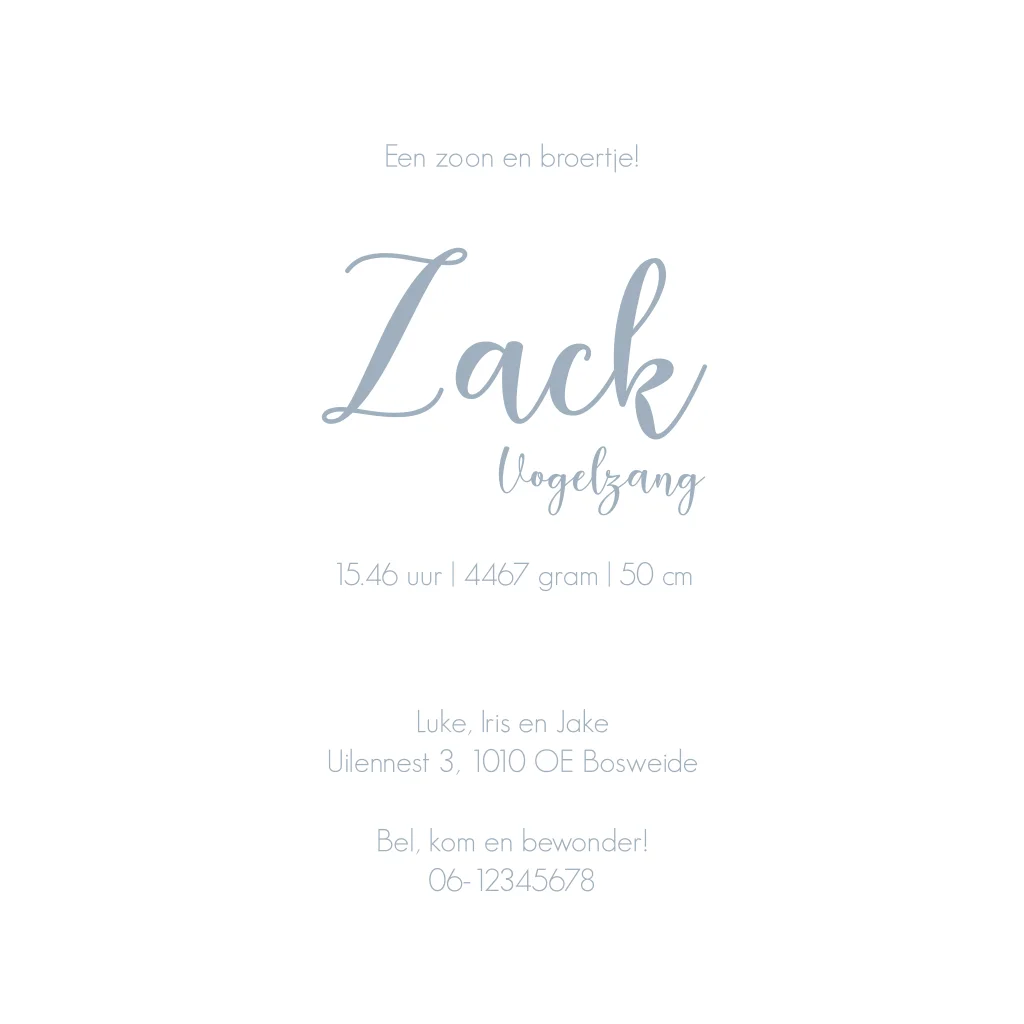 Een minimalistisch blauw geboortekaartje met lijntekening van grote broer en klein broertje. Kaartje Zack oogt erg zacht en lief door de het blauwe wolkje en schattige lijntekening van de broertjes.