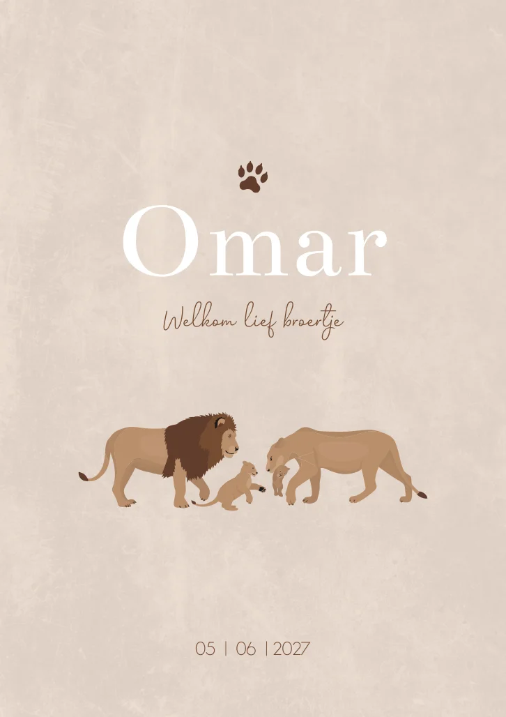 Een stoer beige linnen look Savanne geboortekaartje met een illustratie van een leeuwen familie. De leeuwin heeft een welpje in haar bek en grote broer wil met het welpje spelen. Wil je liever andere diertjes op kaartje Omar? Neem dan een kijkje in onze editor voor alle opties.