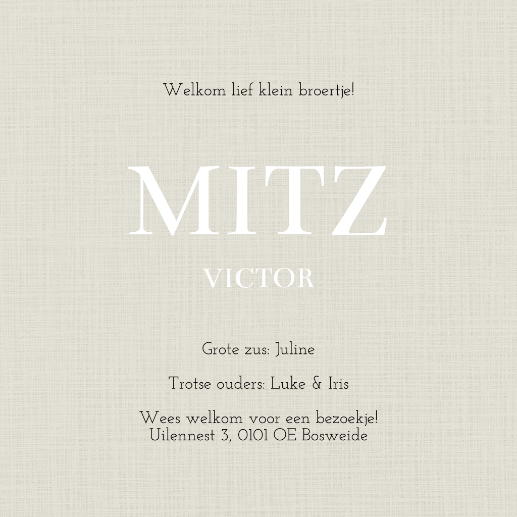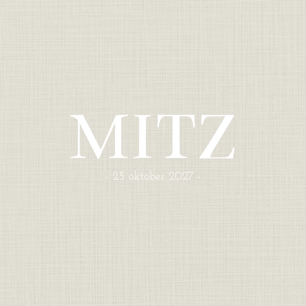 Beige/crème linnen look geboortekaartje met gouden letters. Geboortekaartje Mitz is een rustig en clean model kaart. Wil je dit kaartje in een ander formaat? Geen probleem, je kan hierboven zelf het formaat veranderen. Kom je er niet uit? neem dan gerust contact met ons op.
