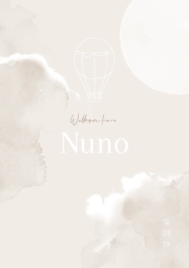 Een neutraal kleur babykaartje met een luchtballon in de wolken. Voor onze kleine avonturiers. Kaartje Nuno is een hip en trendy kaartje, volledig zelf aan te passen qua kleur, opmaak en lettertype. Wil je onze gratis hulp erbij, stuur ons dan een berichtje.