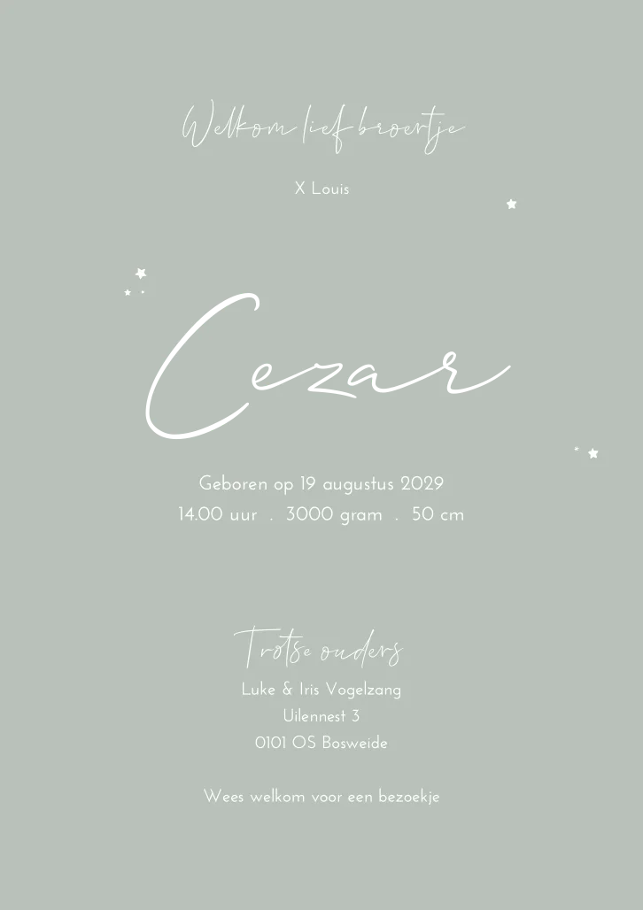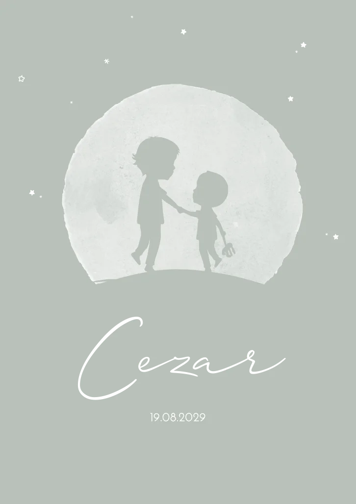 Een zacht groen 'early dew' geboortekaartje met een witte maan. Op kaartje Cezar is een silhouet tekening van een grote broer met zijn kleine broertje te zien. Ziet jouw gezin er anders uit? In onze beeldbank kun je veel meer soorten lijntekeningen vinden.