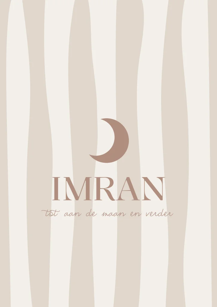 Een prachtig Beige/camelkleurig gestreept baby kaartje Imran met een maantje.