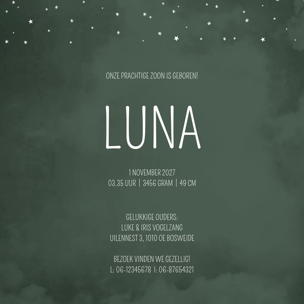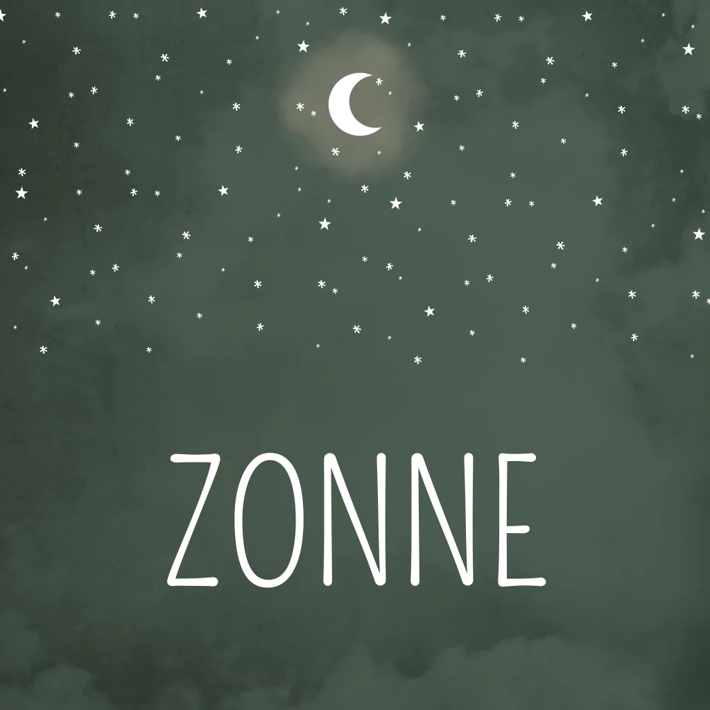 Een donker groen geboortekaart met koperen maan en sterretjes. Geboortekaartje Zonne is ontzettend mooi wanneer je het laat bedrukken met koperfolie. Liever een ander lettertype? Je past het kaartje eenvoudig aan in de editor!