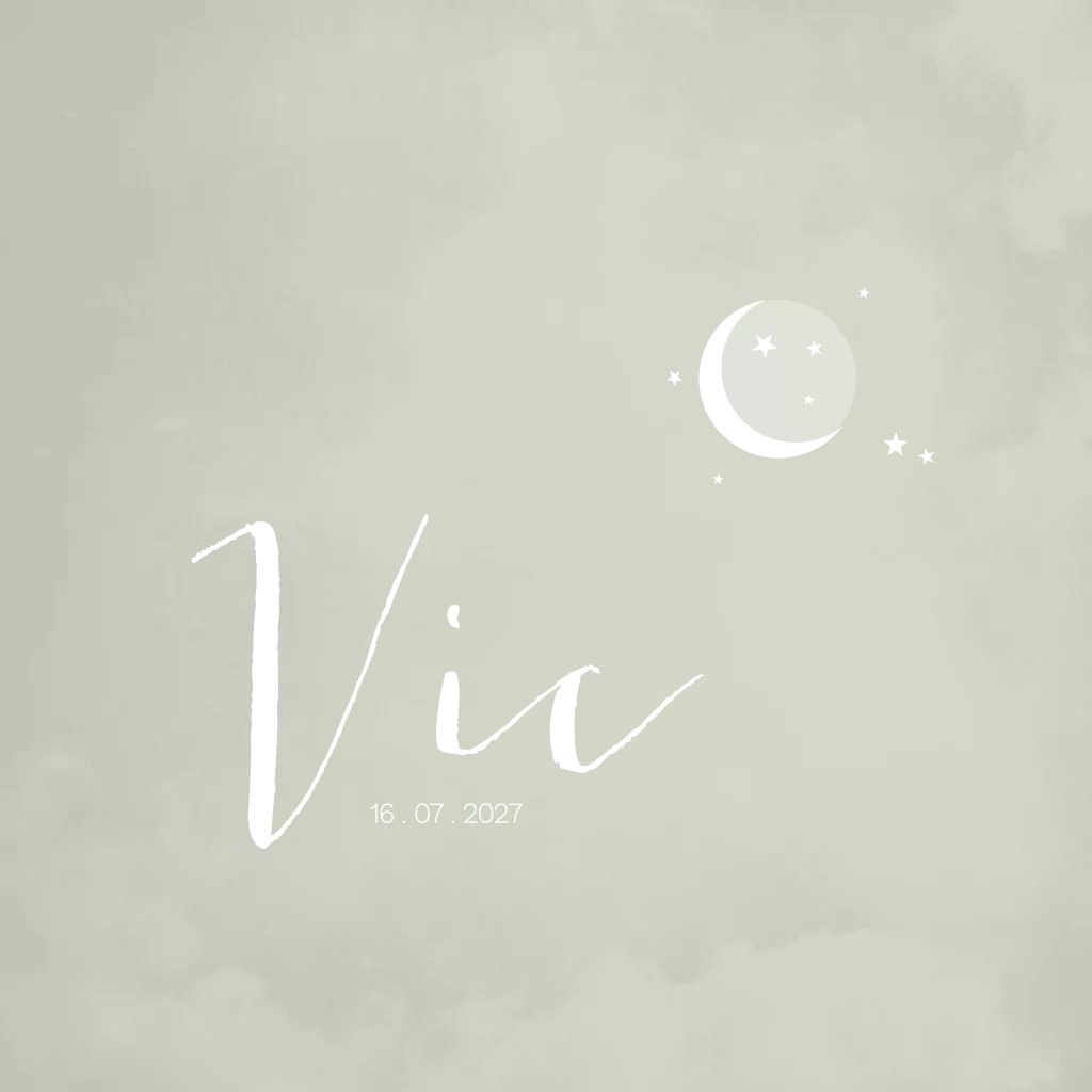 Hip geboortekaartje Vic in trendy gewolkt mint groene pastel kleur. Op de kaart is een maantje met sterretjes geplaatst die je in goudfolie kunt laten drukken, zo ook de naam. De kaart kun je zelf maken in onze editor!