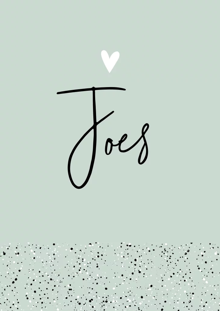 Een mintgroen geboortekaartje met zwarte en witte stippen. Op kaartje Joes staat de naam in een sierlijk en speels lettertype op de kaart. Wil je graag iets aanpassen? Neem dan een kijkje in onze editor!