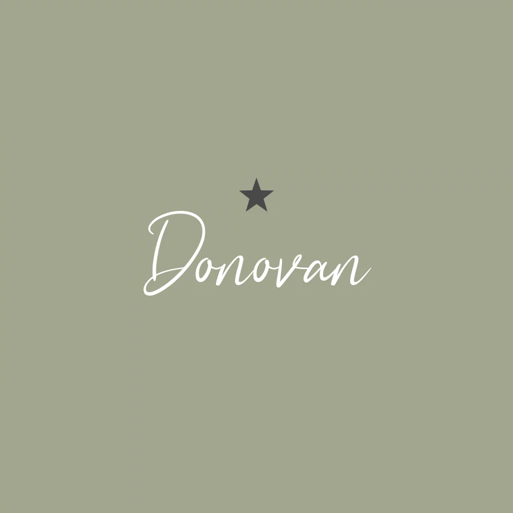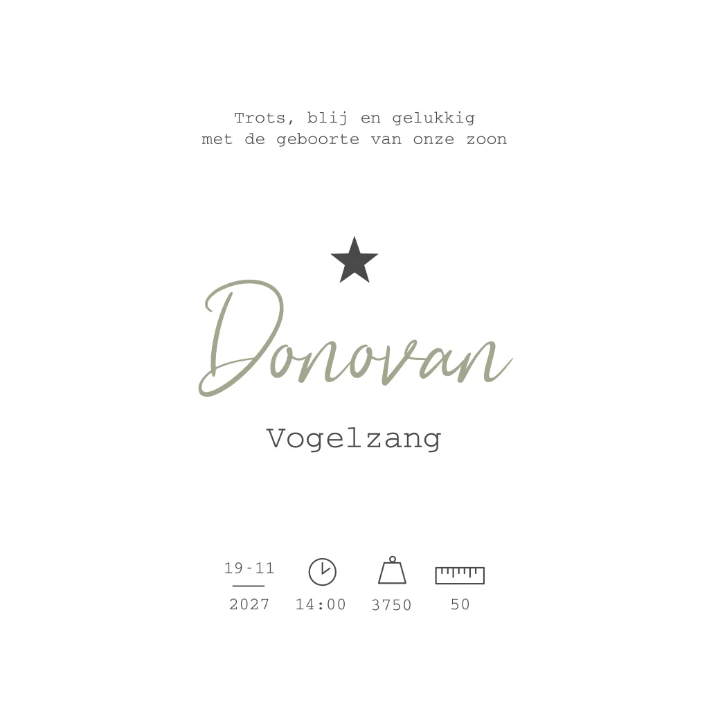 Stoer clean geboortekaartje in mosgroene kleur. De naam in sierlijke witte letters en een antraciet grijs kleurig sterretje. Het kaartje is gemakkelijk en snel aan te passen naar je eigen wensen. Zo maak je dit ontwerp in je eigen kleur en lettertypes. Bestel daarna je proefdruk zodat je het thuis kunt bekijken en ervaren!