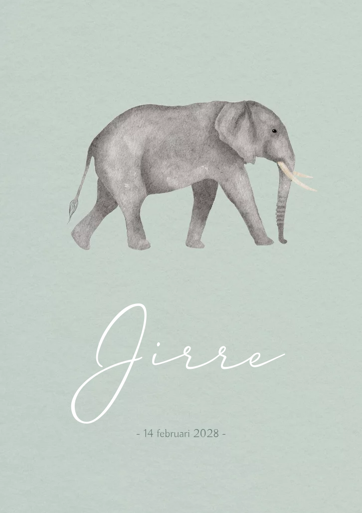 Een minimalistisch lichtblauw geboortekaartje met een illustratie van een olifant. De tekening op kaartje Jirre is in watercolor/waterverf stijl getekend. Je past de kaart eenvoudig aan naar je eigen wensen.
