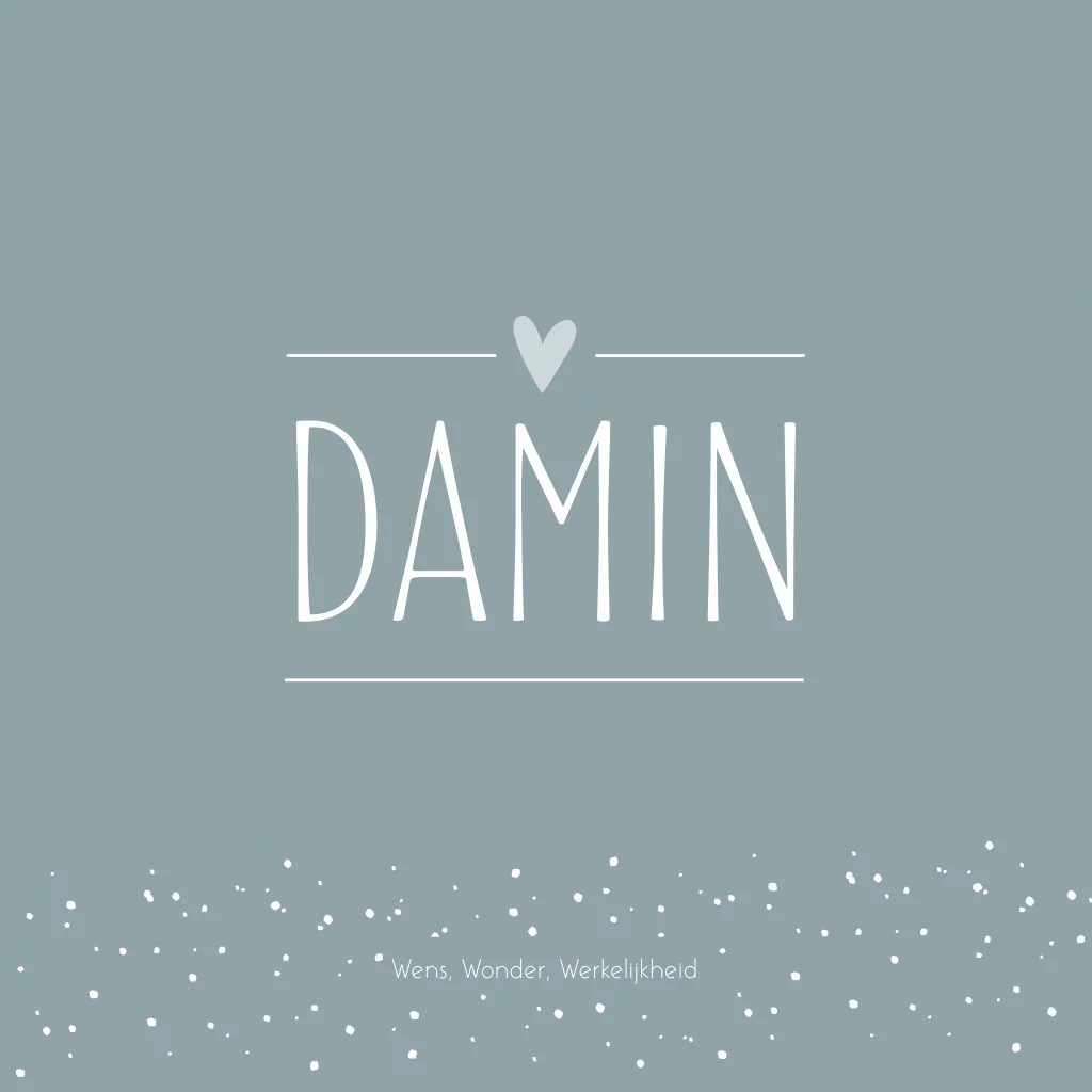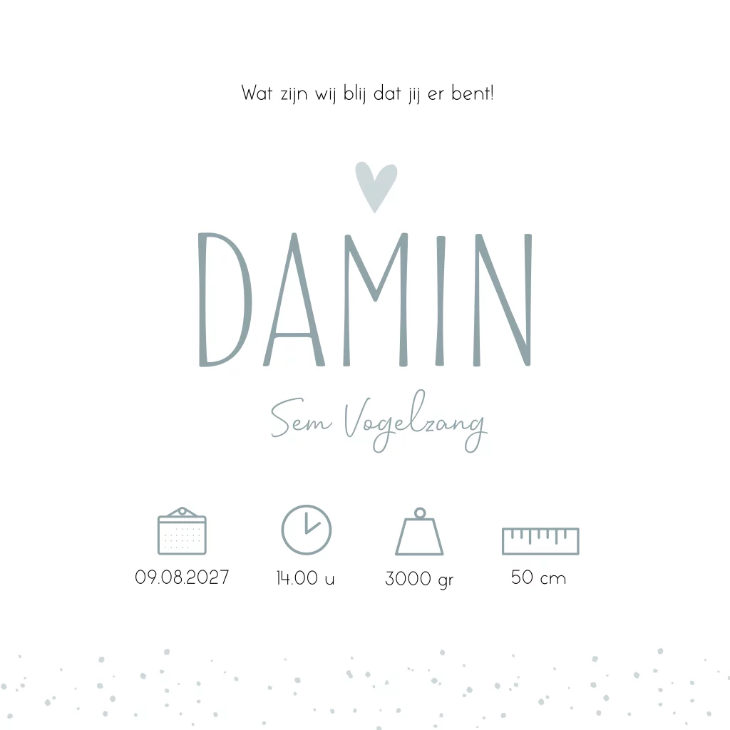 Geboorte kaartje in oud blauwe kleur met witte letters en lichtblauwe hartjes. De subtiele stipjes op geboortekaartje Damin maken het kaartje helemaal af.
