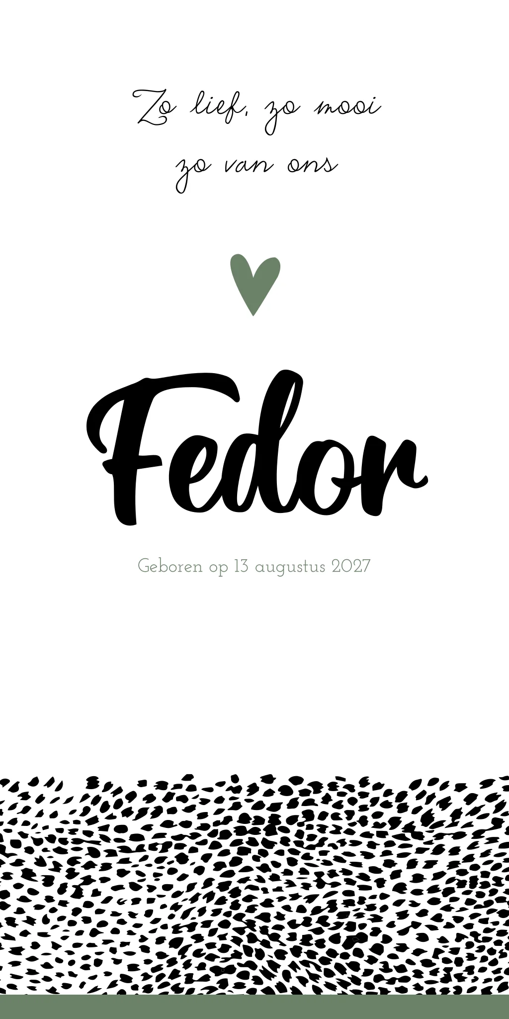 Een stoer geboortekaartje met een panterprint aan de onderzijde. Op kaartje Fedor staat aan de onderzijde van de kaart een groene rand. De combinatie met een stoer en romantisch lettertype maakt het een bijzonder ontwerp.