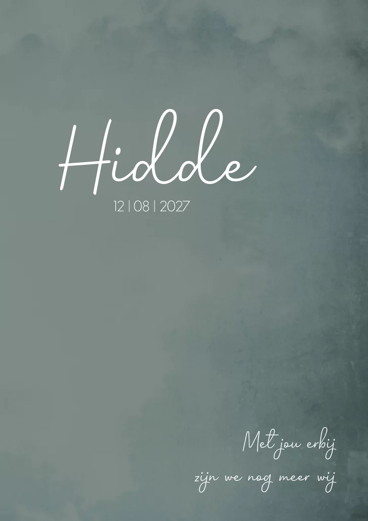 Petrolkleurig gewolkt geboortekaartje met goudfolie letters voor de naam. Kaartje Hidde is door de speelse indeling op de achterzijde een bijzonder kaartje!