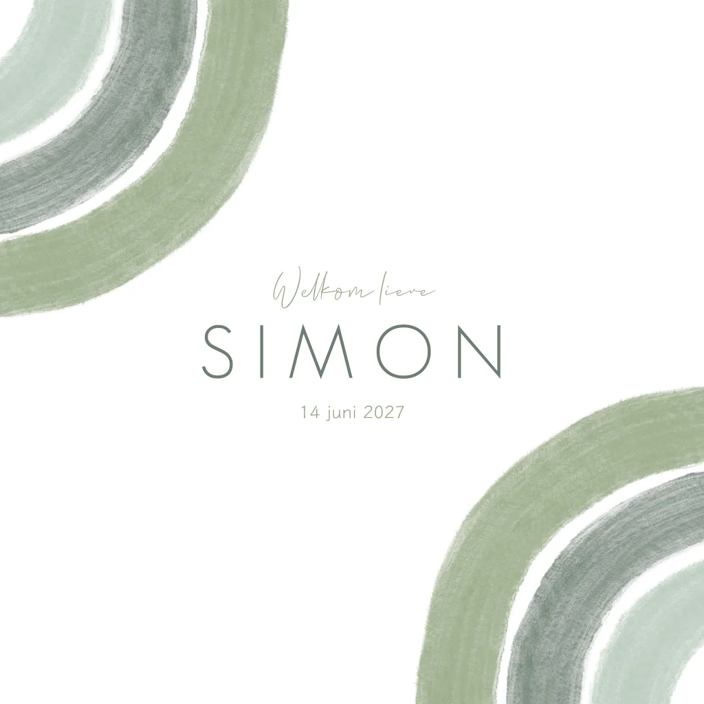 Een eenvoudig wit geboortekaartje met bogen in groentinten. Kaartje Simon kan je volledig naar eigen wens aanpassen in onze editor.