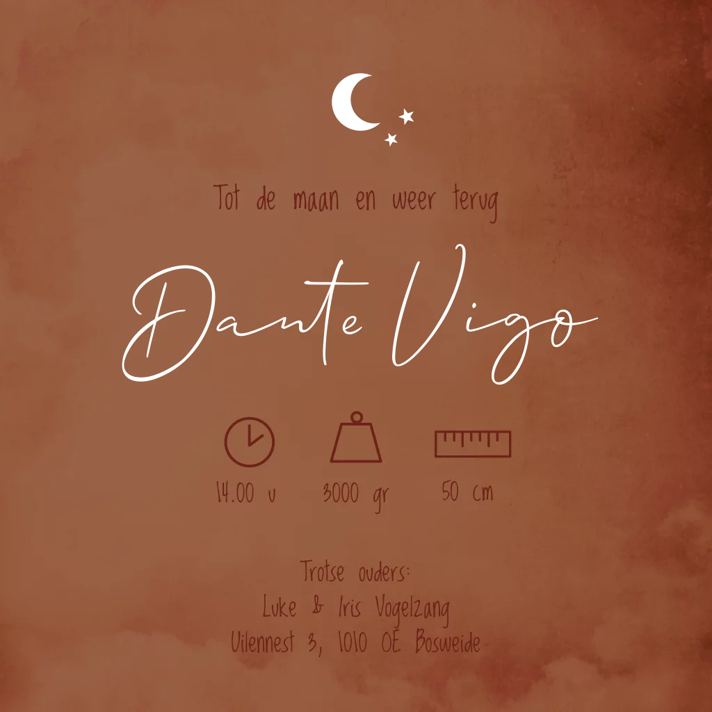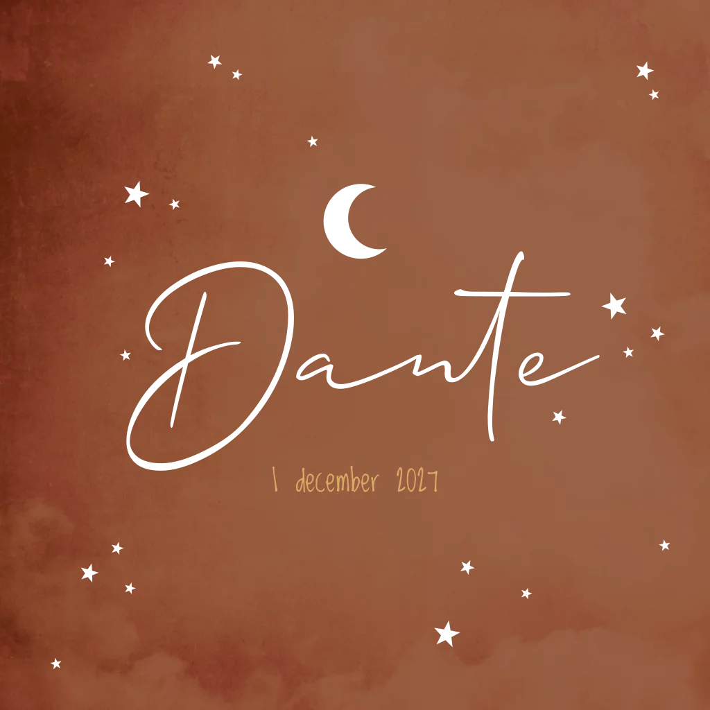 Roest bruin geboortekaartje met wolkjes, sterretjes en maantjes. Geboortekaartje Dante is romantisch geboortekaartje in het thema heelal. Dit kaartje is ontzettend mooi in goudfolie, zo kan je de maan en de sterren te laten 'schijnen'.