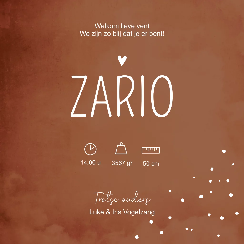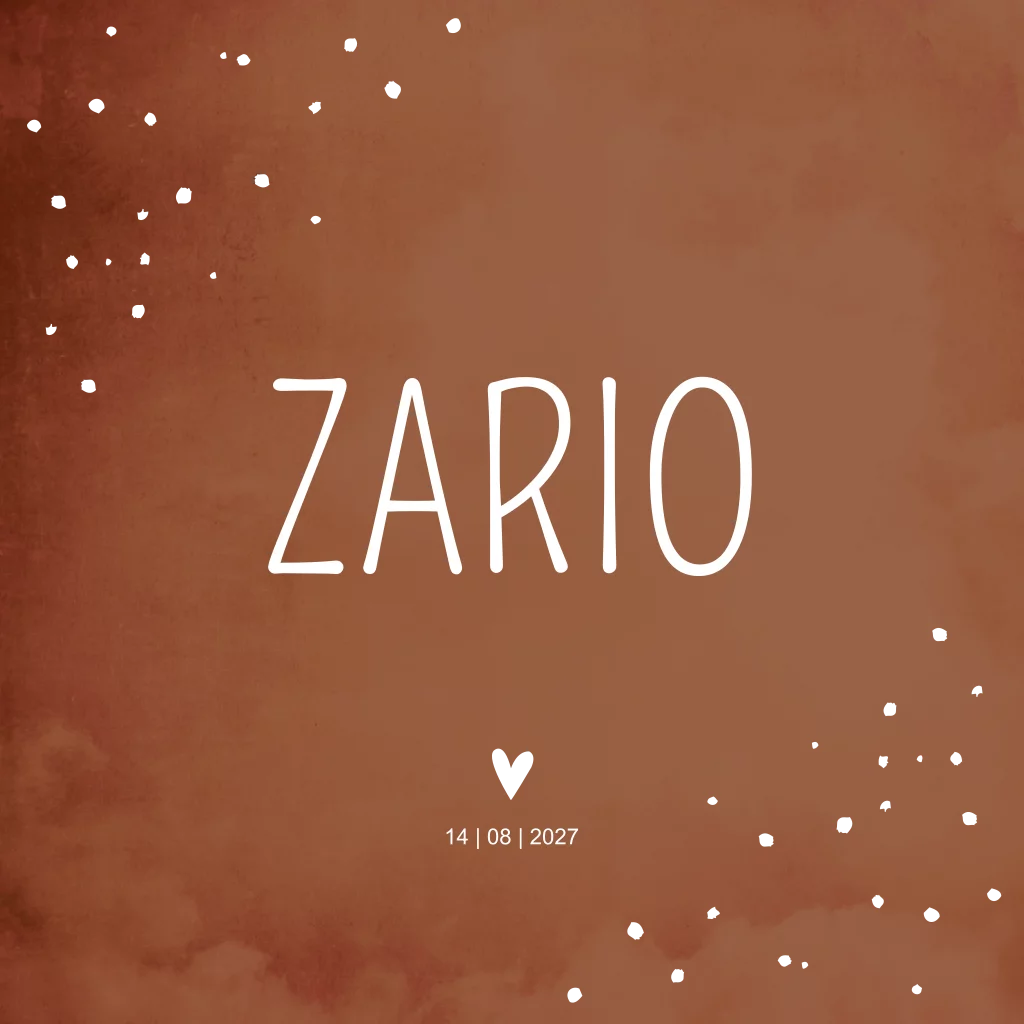 Roestbruin geboortekaartje met hartjes en stipjes. Laat geboortekaartje Zario bedrukken met goudfolie zodat de stipjes extra mooi uitkomen. Heb je liever een ander lettertype op de kaart? Of een andere kleur achtergrond? Geen probleem, je past het geboortekaartje eenvoudig zelf aan in de editor.