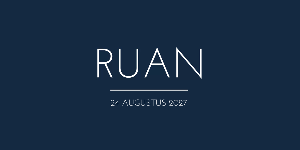 Een modern en strak geboortekaartje met een donkerblauwe achtergrond. Op de voorzijde staat het moderne en klassieke design in goudfolie zodat de naam er extra uitspringt. Wil je kaartje Ruan graag aanpassen? Neem dan een kijkje in onze editor voor alle opties.