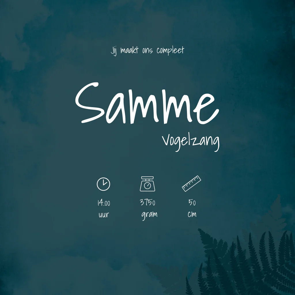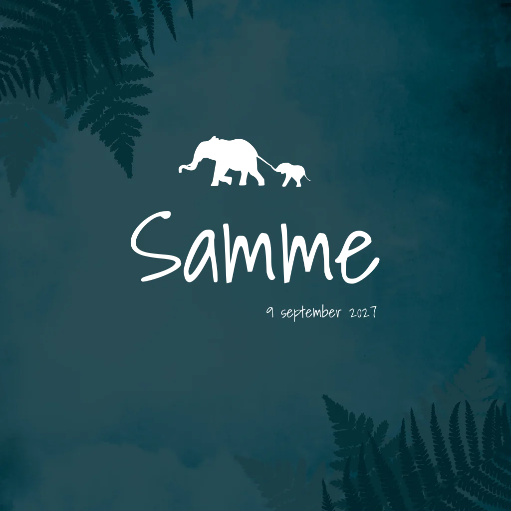 Een stoer blauw geboortekaartje met gouden olifantjes. Kaartje Samme is een speels geboortekaartje met een illustratie van varens aan de zijkanten. Wil je liever een ander dier? Neem dan een kijkje in onze editor voor alle mogelijkheden. Mis je nog iets? Neem dan contact met ons op!