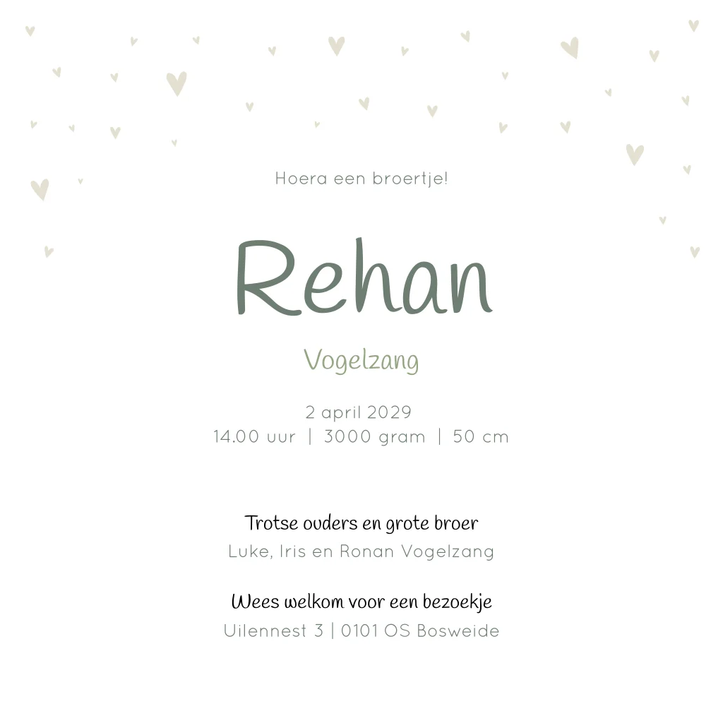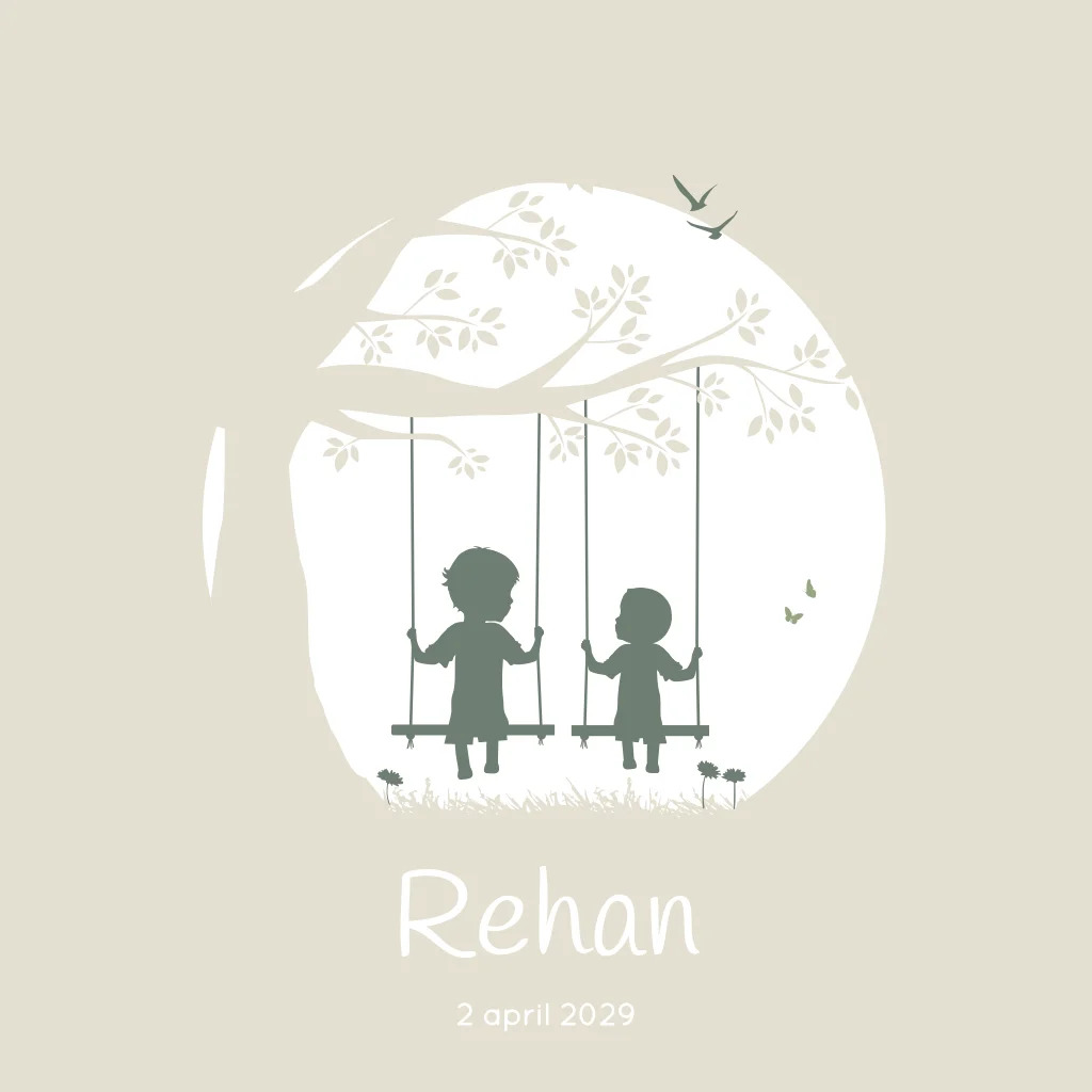 Beige met groen geboortekaartje met een silhouet illustratie van twee broertjes op een schommel. De schommel op kaartje Rehan hangt in een boom. Verder staan er op het kaartje een paar vlindertjes en vogeltjes. Wil je graag iets aanpassen? Neem dan een kijkje in onze editor voor de vele opties!