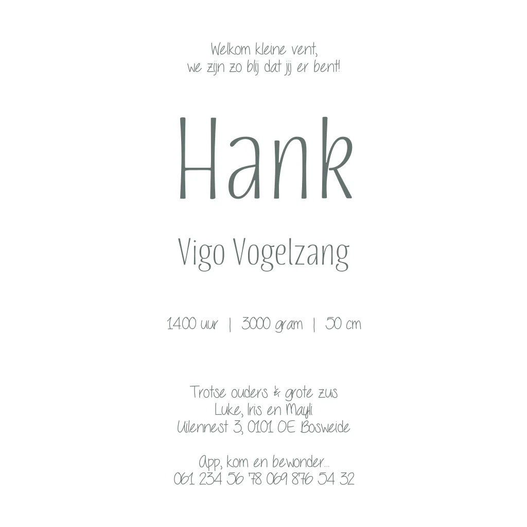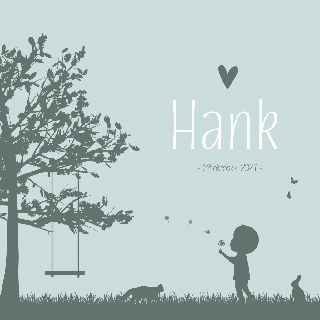 Een blauw geboortekaartje met een jongetje dat een paardenbloem wegblaast. Hij wordt omringt door verschillende dieren. Geboortekaartje Hank is een silhouet-illustratie kaartje waarbij je de illustraties eenvoudig zelf kunt aanpassen in de editor zodat het past bij jouw gezinssituatie. Heb je hulp nodig van ons? Of wil je een illustratie op maat? Neem dan contact met ons op.