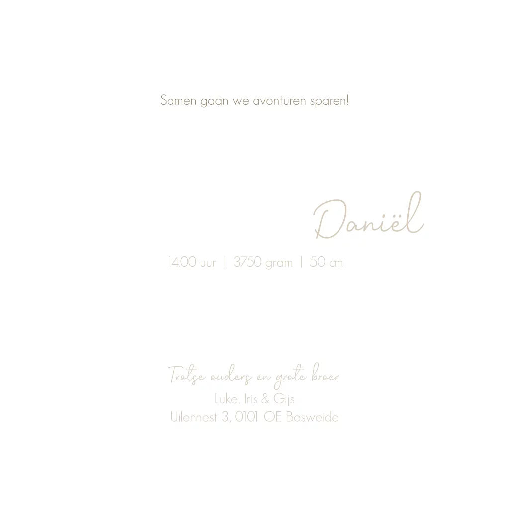 Een dromerig wit geboortekaartje met een beige wolk, waar een grote broer trots op zijn fiets fiets, met zijn zusje achter in het karretje. De liefde spot er vanaf in de vorm van hartjes in koperfolie.