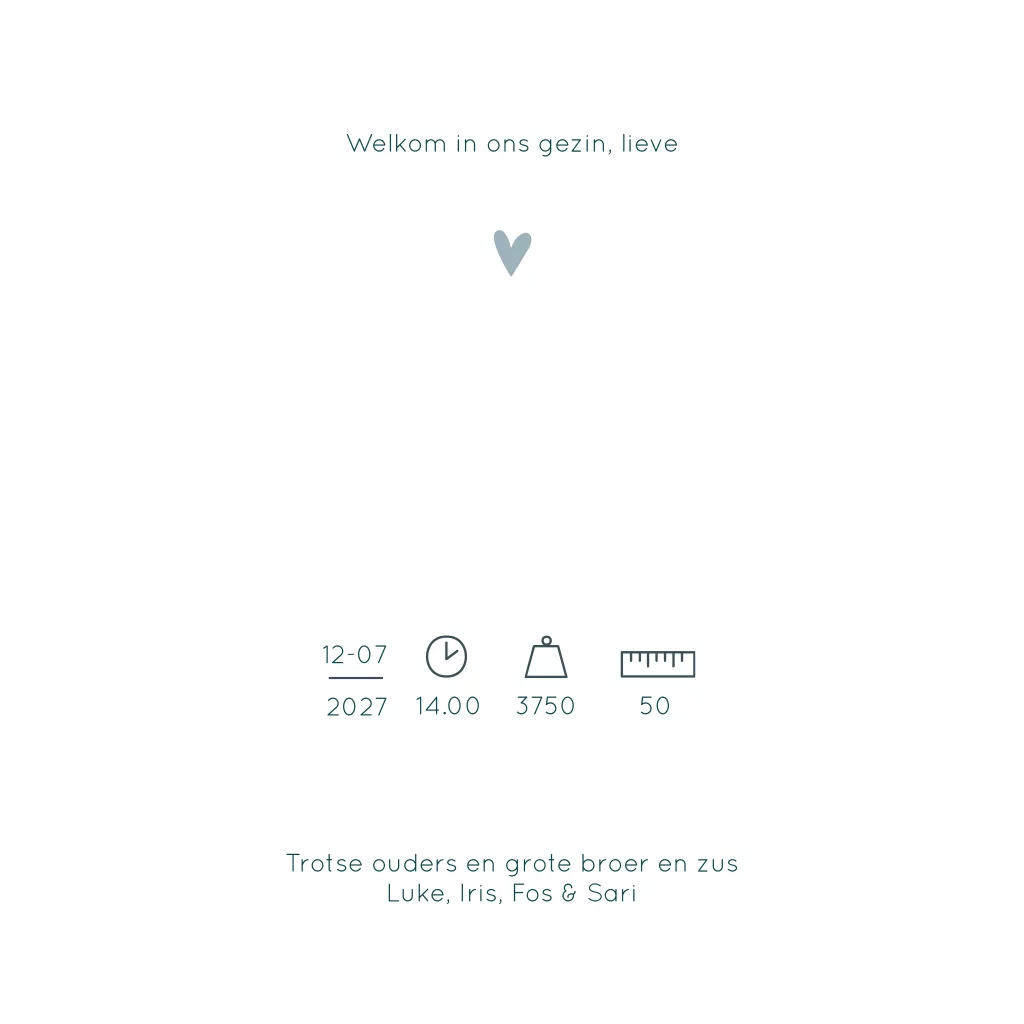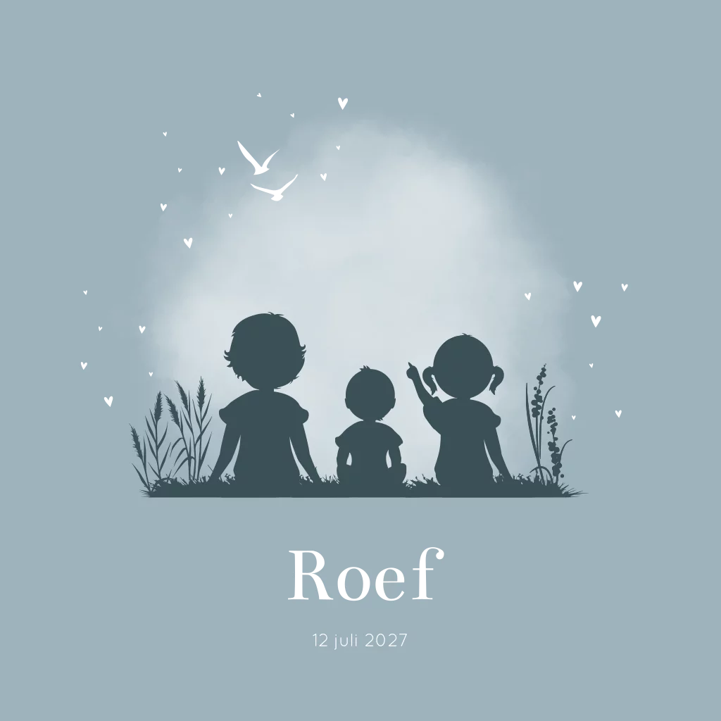 Een blauw geboortekaartje Roef met een silhouet illustratie van een grote broer en zus die met hun kleine broertje in het gras zitten. Ze kijken en wijzen samen naar de vliegende vogeltjes. Ze worden omringd door hartjes.