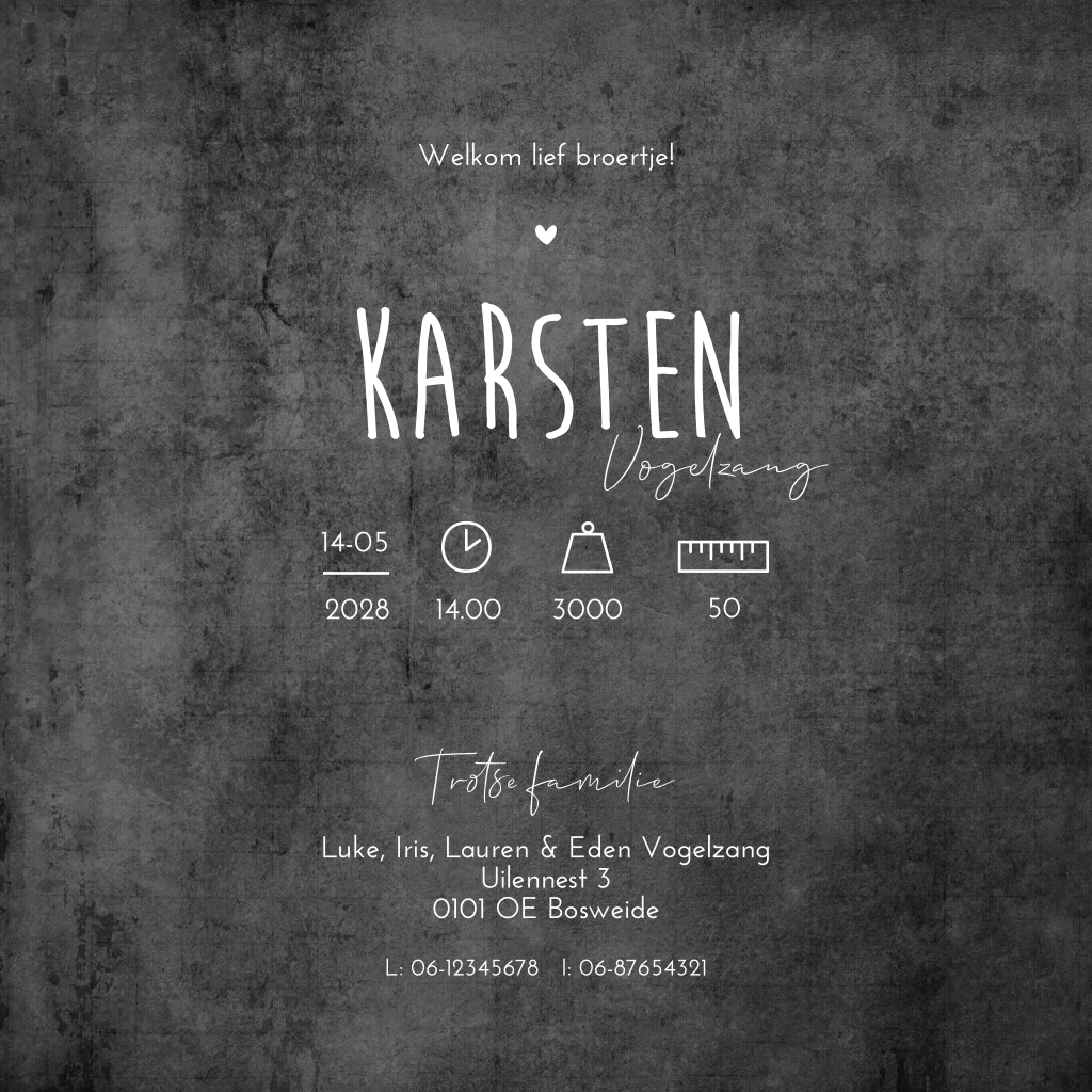 Een stoer hip en tijdloos trendy geboortekaartje Karsten in een donkere en zwarte kleur met goudfolie voor de namen en de silhouetten van de kindjes. Wil je graag iets aanpassen? Neem dan een kijkje in onze editor voor de vele opties!
