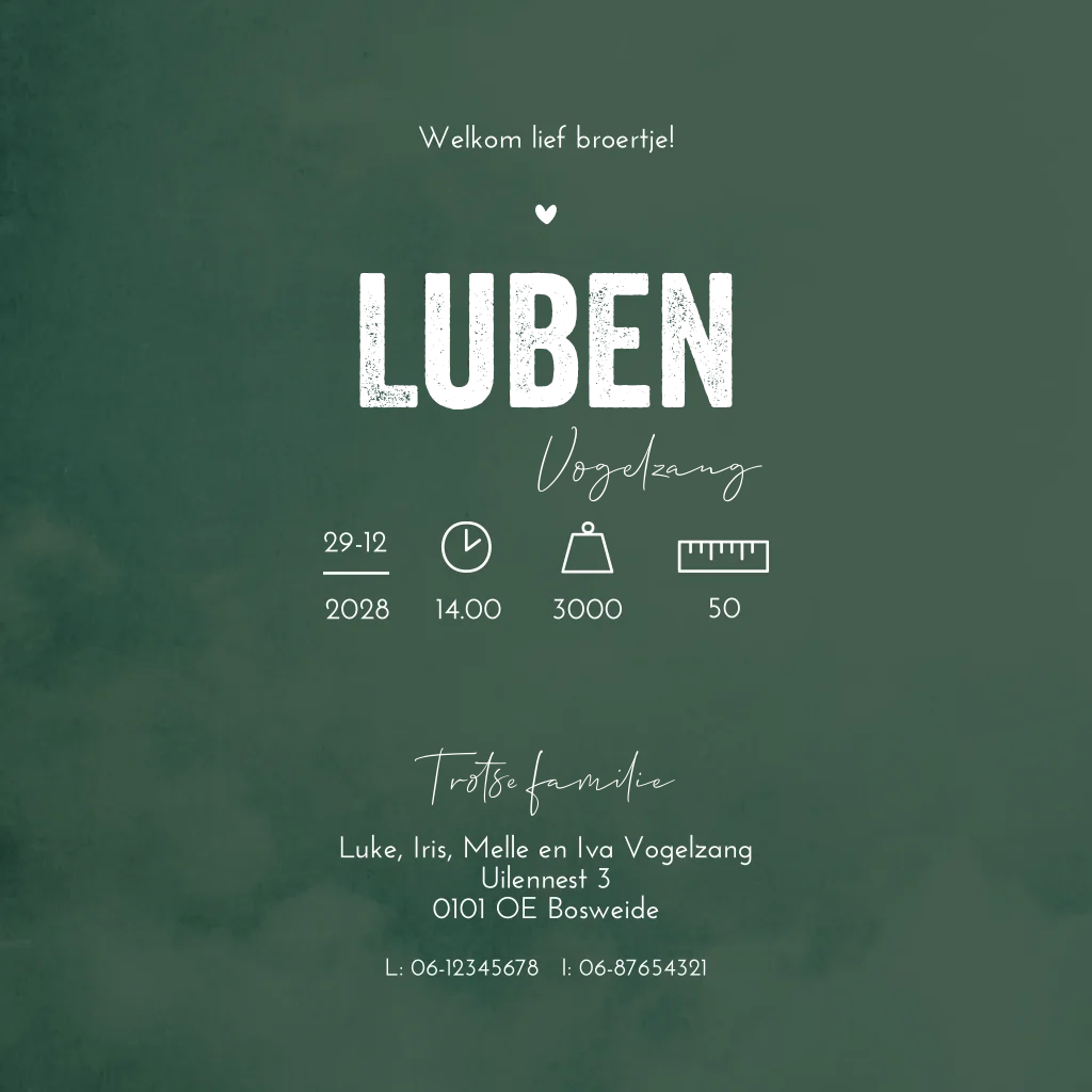 Een stoer hip en tijdloos trendy geboortekaartje Luben in een warme donkergroene kleur met goudfolie voor de namen en de silhouetten van de kindjes. Wil je graag iets aanpassen? Neem dan een kijkje in onze editor voor de vele opties!
