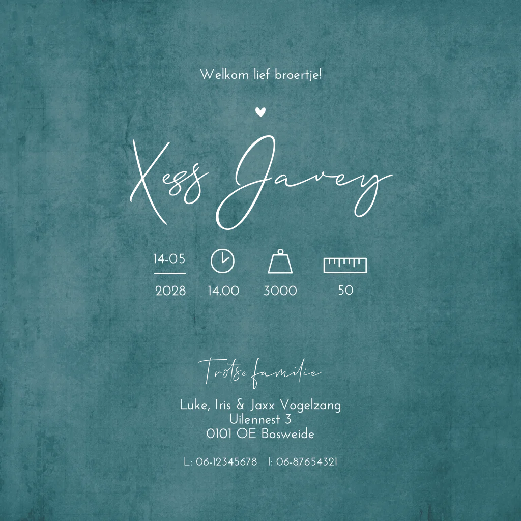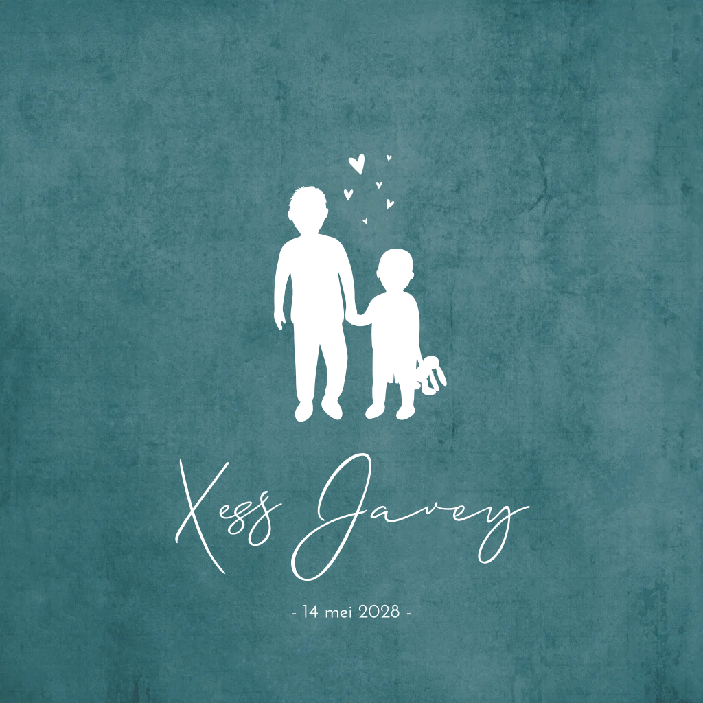 Een stoer hip en tijdloos trendy geboortekaartje Xess Javey in een warm blauw groene kleur met goudfolie voor de namen en de silhouetten van de kindjes. Wil je graag iets aanpassen? Neem dan een kijkje in onze editor voor de vele opties!