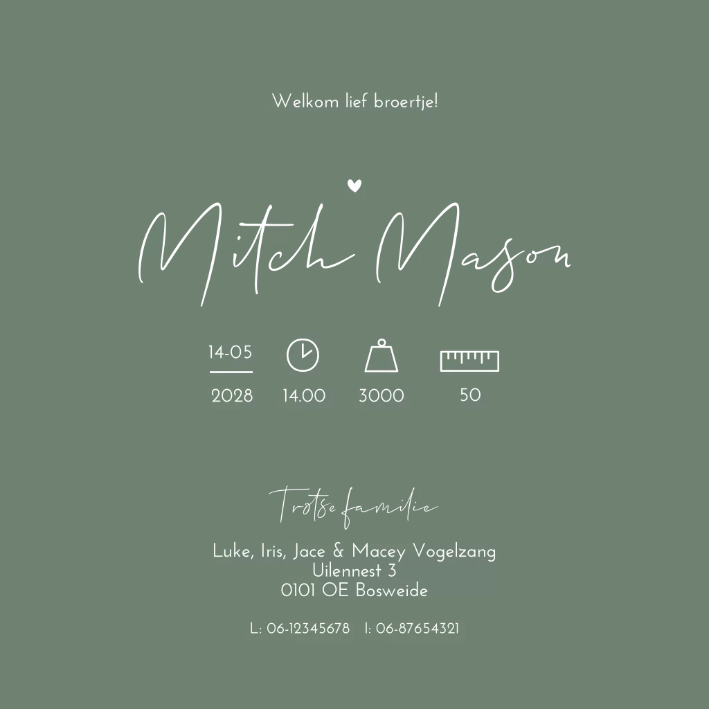 Een stoer hip en tijdloos trendy geboortekaartje Mitch in een warme donkergroene kleur met koperfolie voor de namen en de silhouetten van de kindjes. Wil je graag iets aanpassen? Neem dan een kijkje in onze editor voor de vele opties!