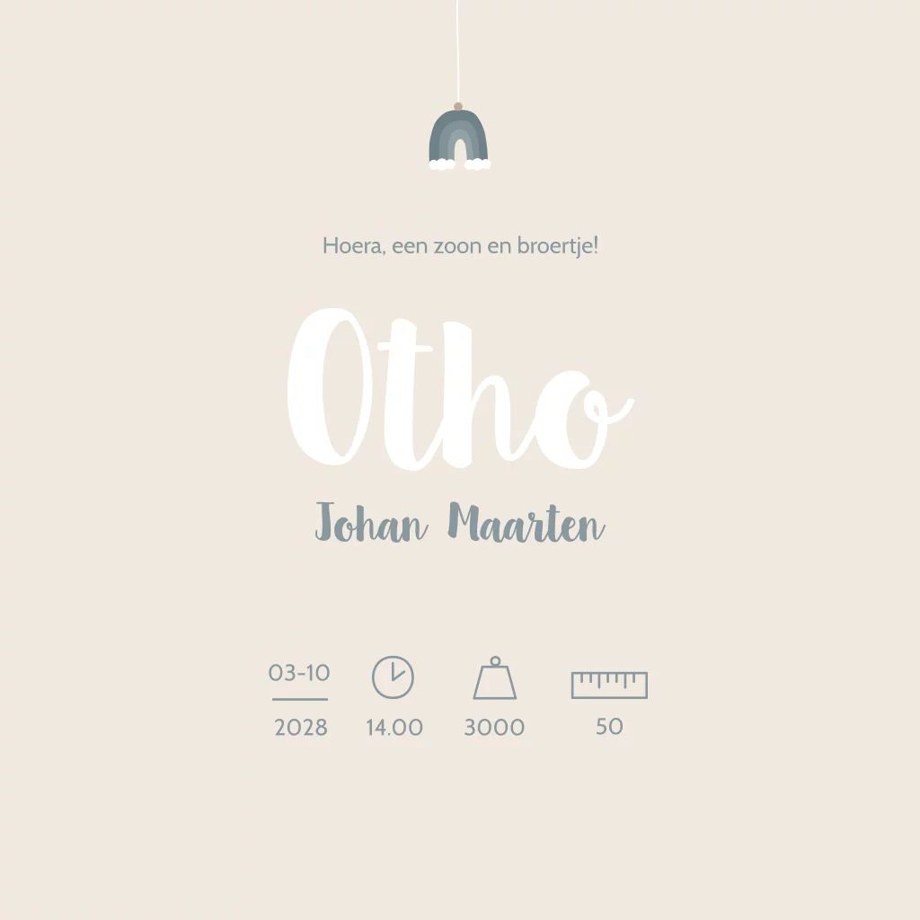 Een lief, hip en tijdloos trendy geboortekaartje Otho in een beige/crème kleur met blauwe details. Op de kaart zie je een grote broer en zus die over het randje van de wieg van hun broertje kijken die in zijn wiegje ligt. Er hangt een regenboogje boven de wieg en op de plank staan speelblokken met de datum van de geboorte en een teddybeertje. Wil je graag iets aanpassen? Neem dan een kijkje in onze editor voor de vele opties!