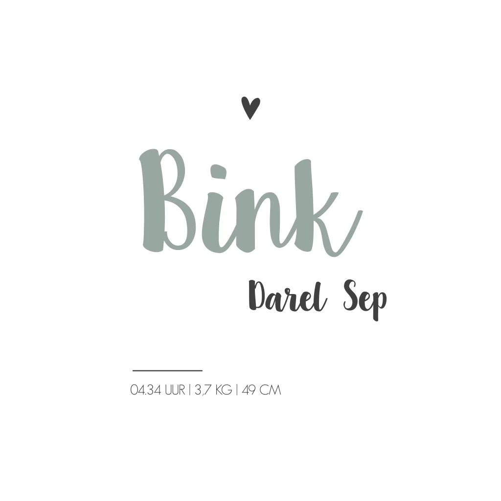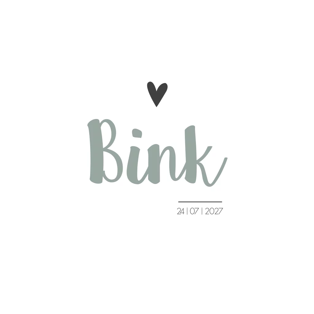 Een wit geboortekaartje met een clean ontwerp. Kaartje Bink heeft de kleuren EarlyDew en antraciet. Neem een kijkje in onze editor voor alle mogelijkheden wat betreft aanpassingen.