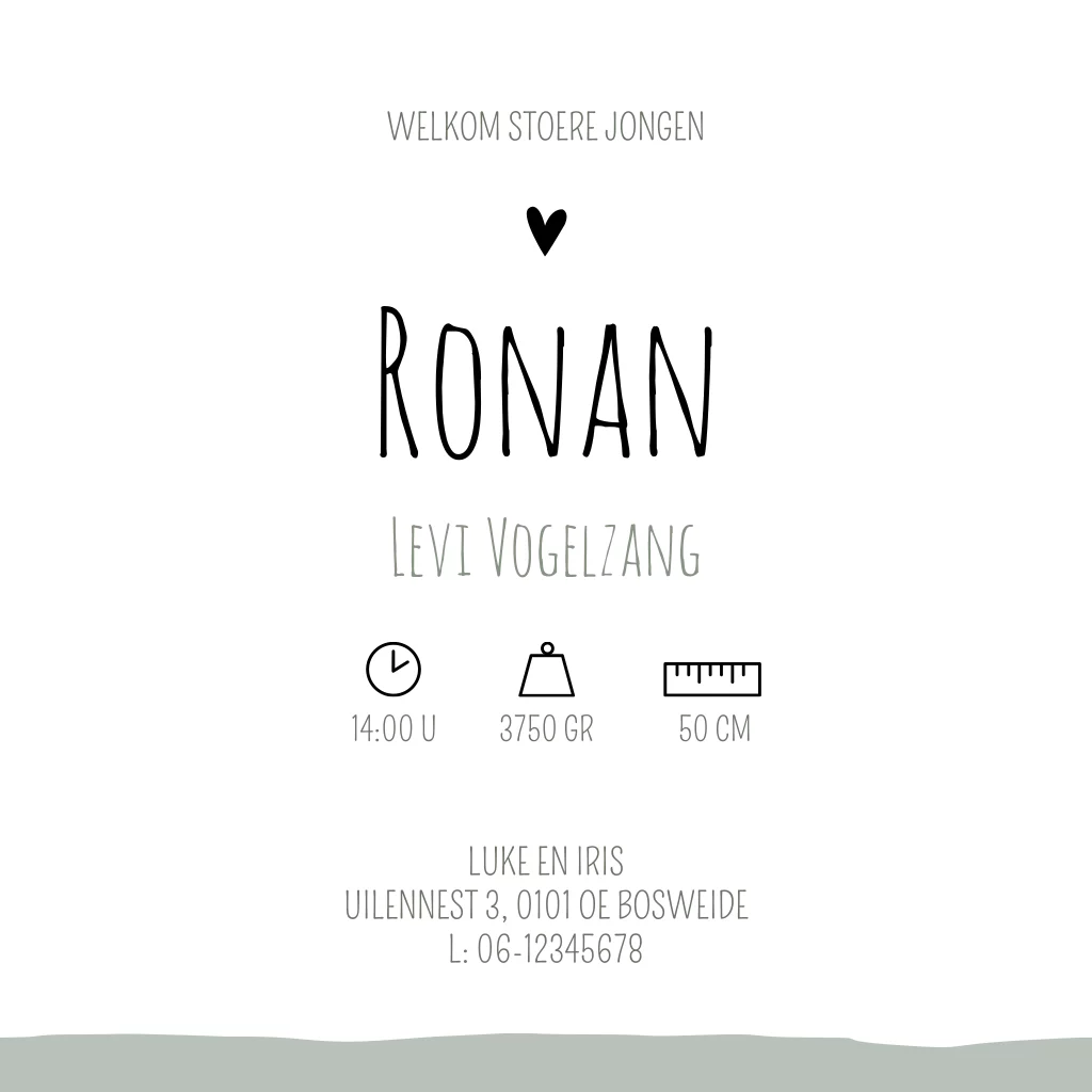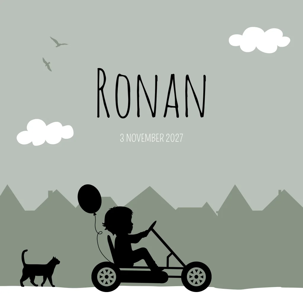 Een stoer geboortekaartje in verschillende groentinten. Op kaartje Ronan zie je een jongetje op een skelter die door zijn wijk rijdt. Verder zie je verschillende huisjes, een kat en een ballon. Wil je graag iets aanpassen? Neem dan een kijkje in onze editor voor de vele opties!