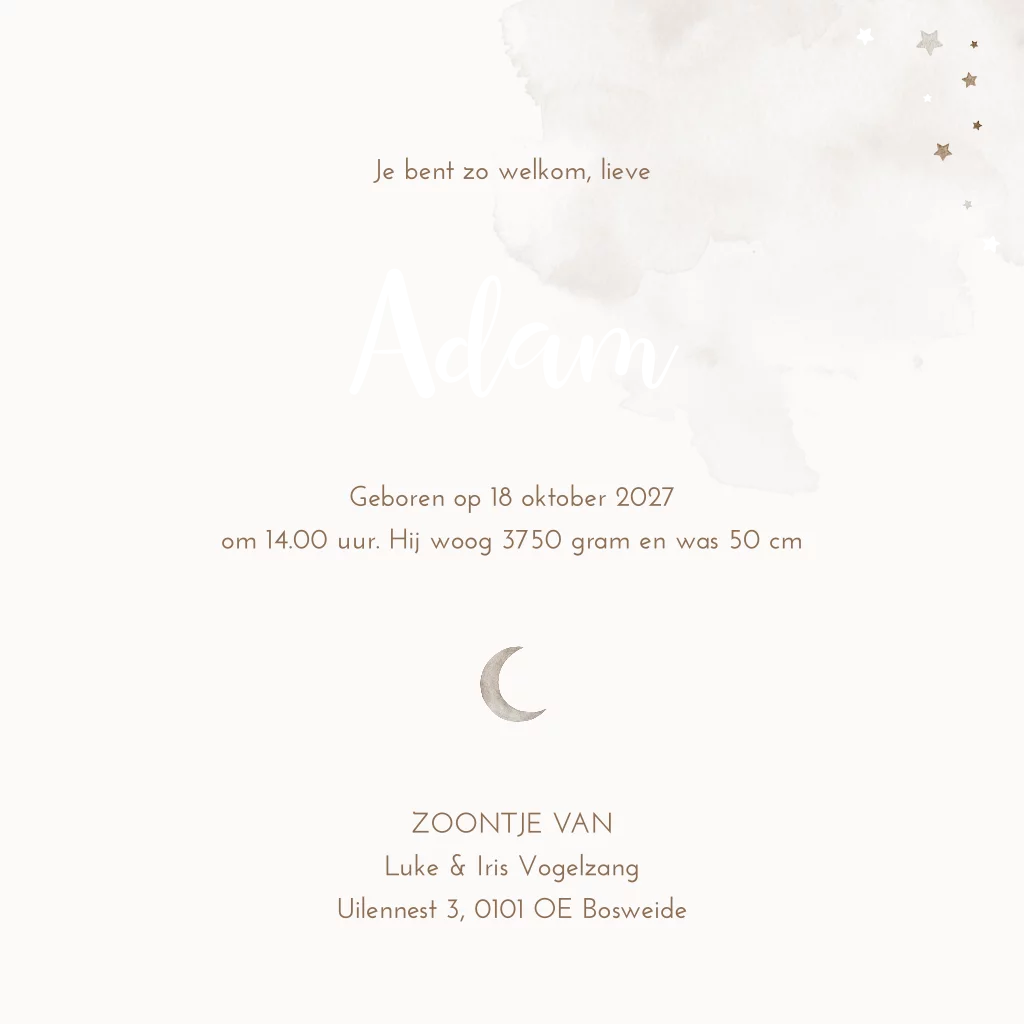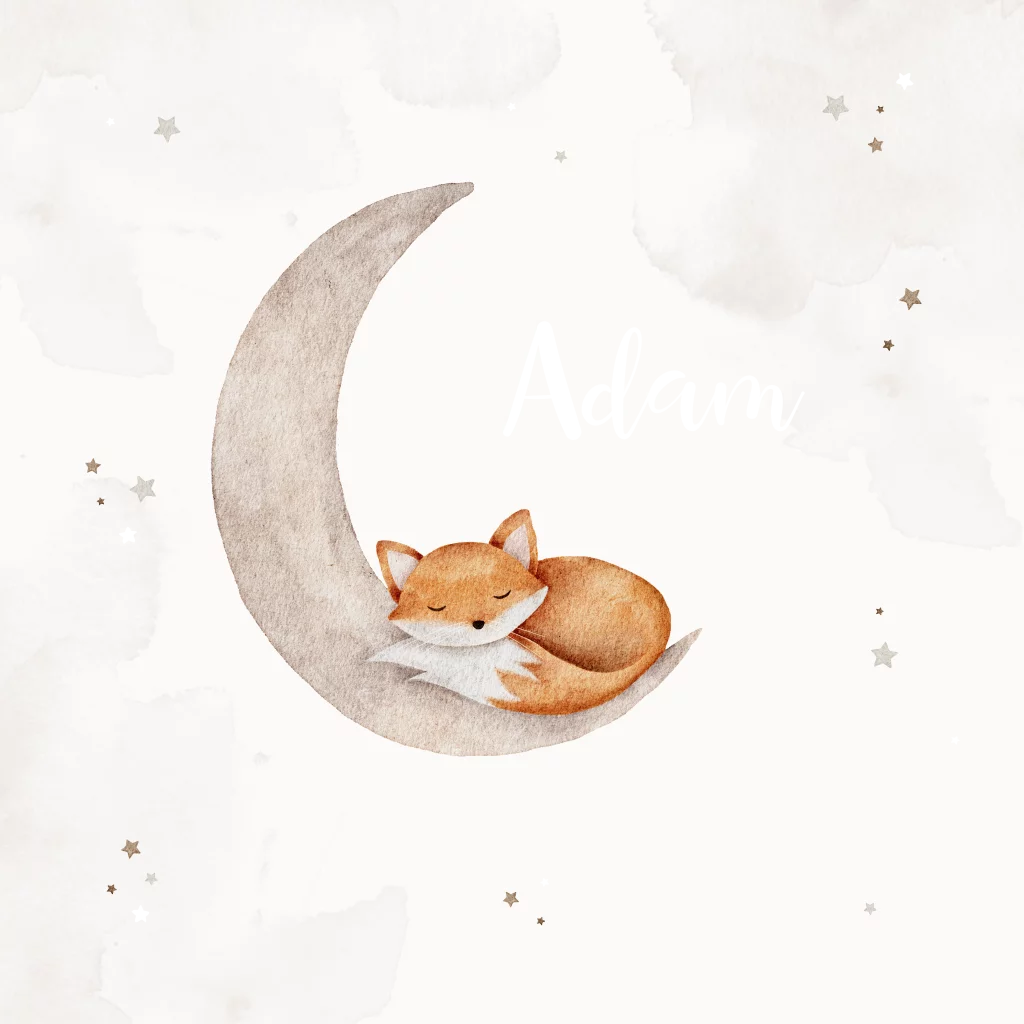 Love you to the moon and back! Een neutraal beige geboortekaartje met een waterverf illustratie van een schattig slapend vosje op de maan. Het vosje wordt omringd op kaartje Adam door kleine sterretjes in watercolor en koperfolie en op de achtergrond zie je waterverfvlekken. Aan de binnenzijde is ruimte voor een mooie foto. Je kunt het kaartje gemakkelijk aanpassen in onze editor.