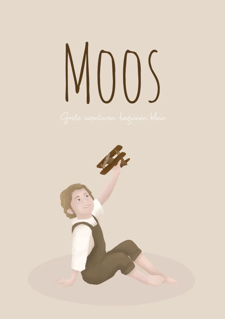 Op dit geboortekaartje is Moos aan het spelen met zijn speelgoed vliegtuig. Een perfect geboortekaartje als je houdt van avonturen/reizen.