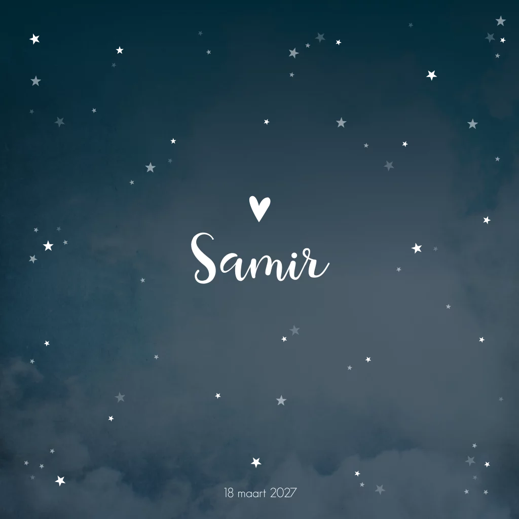 Een donkerblauw geboortekaartje vol met kleine sterren. Een speciaal kaartje voor een speciaal wonder. Kaartje Samir is prachtig wanneer je deze laat bedrukken met koperfolie. Zo glinsteren de sterren je tegemoet!