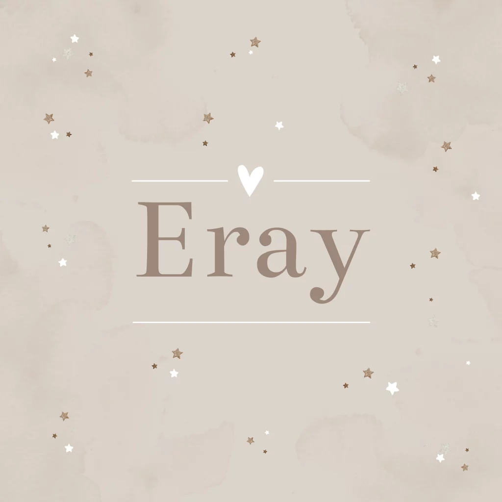 Een neutraal beige/ taupe geboortekaartje Eray met een waterverf achtergrond. Het kaartje is gevuld met allemaal bruine, witte en taupe kleurige sterretjes. Je kunt het kaartje gemakkelijk aanpassen in onze editor.