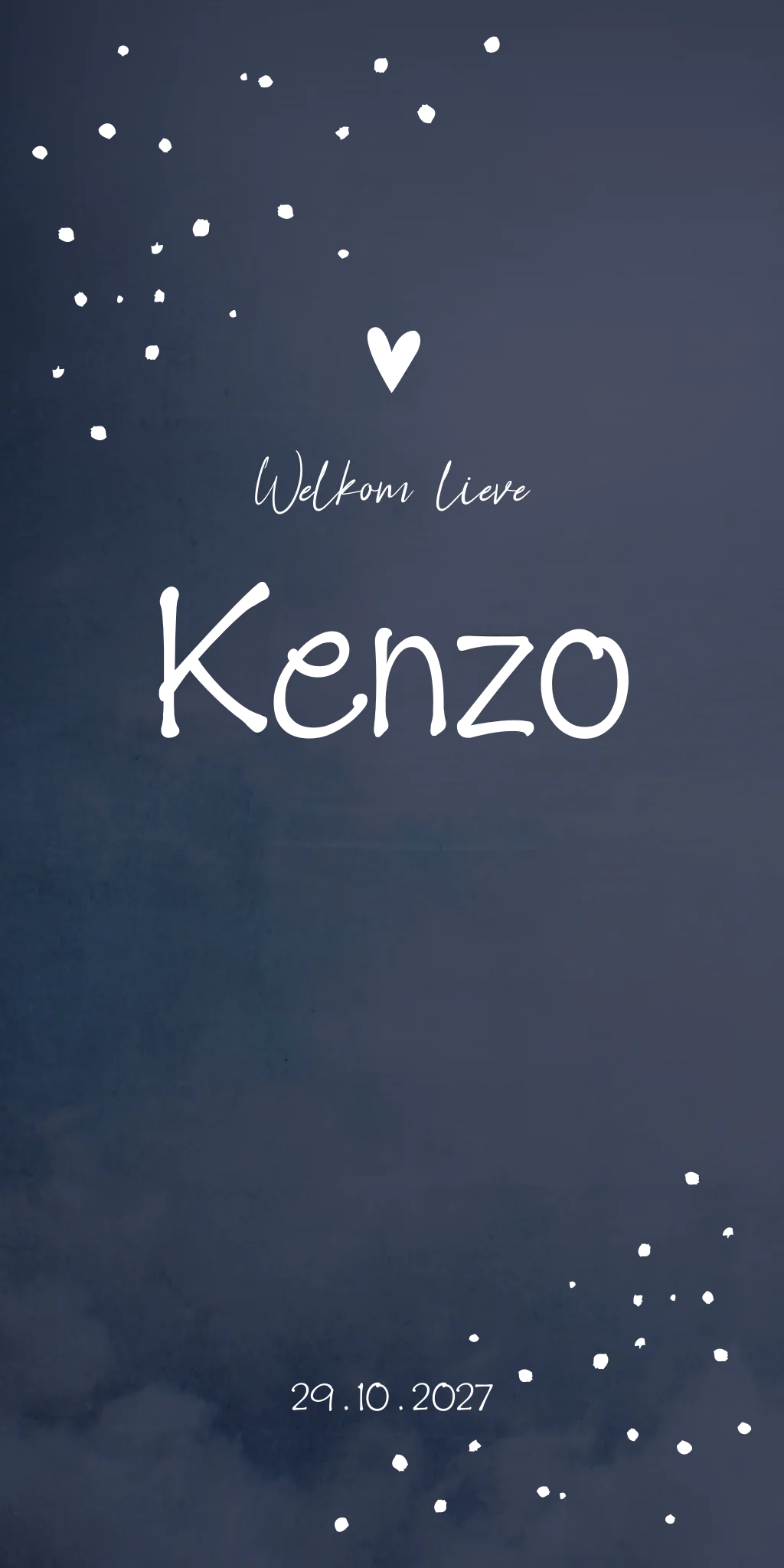 Een stoer donkerblauw geboortekaartje met hartjes en stipjes. Laat de gouden elementen van geboortekaartje Kenzo bedrukken met goudfolie en de kaart zal je tegemoet glimmen. Wil je liever een andere achtergrondkleur? Neem dan een kijkje in onze editor voor alle opties.