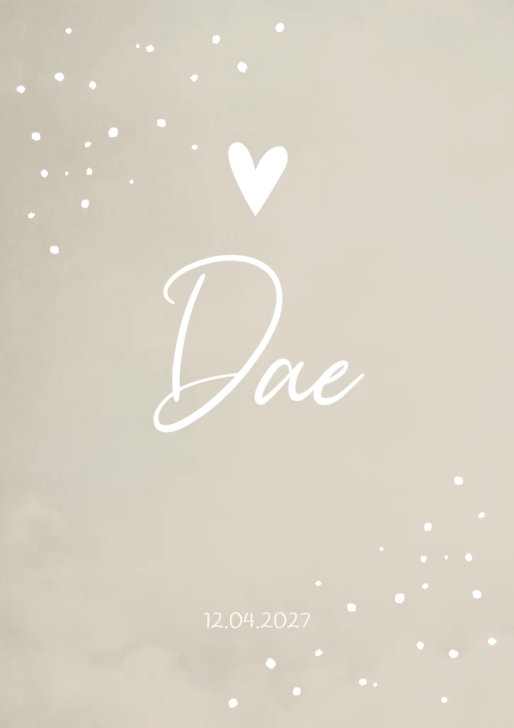 Een stoer beige/ crème geboortekaartje met hartjes en stipjes. Laat de gouden elementen van geboortekaartje Dae bedrukken met goudfolie en de kaart zal je tegemoet glimmen. Wil je liever een andere achtergrondkleur? Neem dan een kijkje in onze editor voor alle opties.