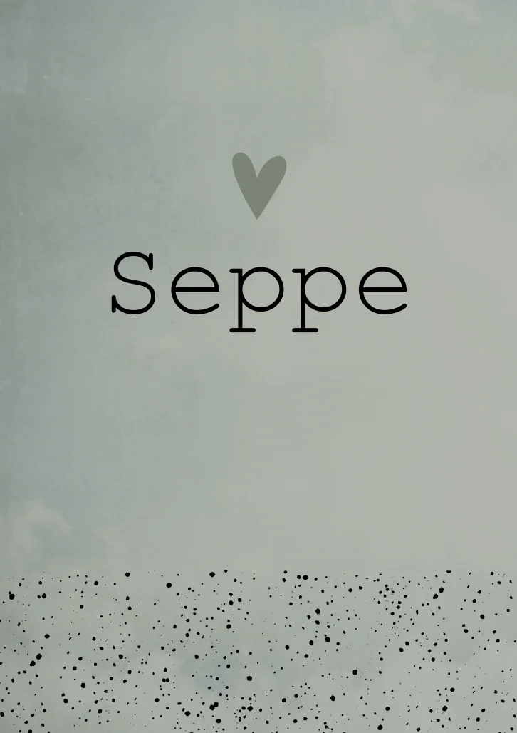 Een stoer oud grijs-groen geboortekaartje met zwarte stippen en een groen hartje. Kaartje Seppe is extra leuk met een label als toevoeging!