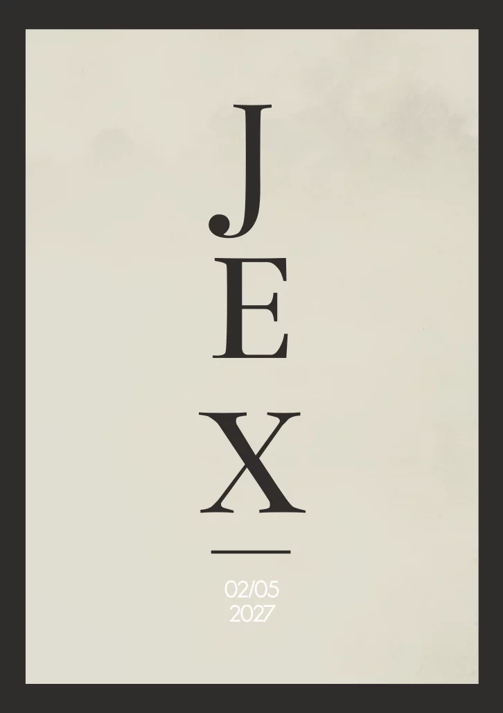 Een stoer geboortekaartje met een beige achtergrond en zwarte omranding. Kaartje Jex is extra bijzonder omdat de naam verticaal staat, dat maakt het kaartje erg speciaal!