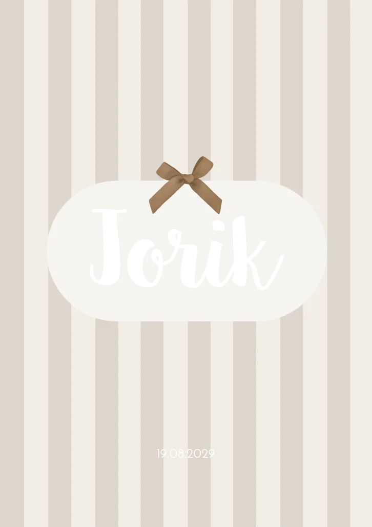 Een beige bruin gestreept geboortekaartje met koperfolie. kaart Jorik bevat een strikje van koperfolie. Dit kun je aanpassen naar een ander icoontje of illustratie.