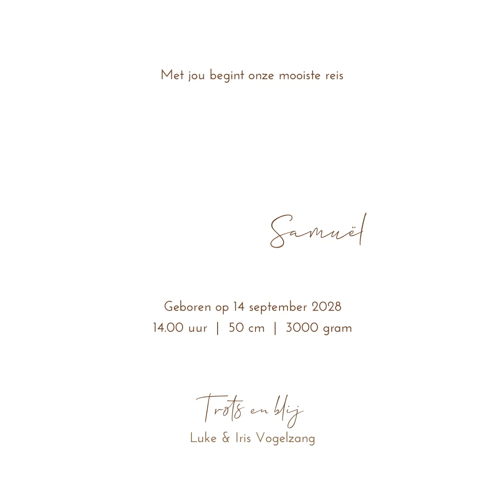 Een stoer, tijdloos en neutraal beige kleurig geboortekaartje Nox. De achtergrond bevat een beige velvetlook/ suede kleur wat het kaartje heel zacht maakt. De letters kunnen staan in koperfolie wat het kaartje extra speciaal maakt. Je past het kaartje eenvoudig en snel aan, in onze online editor.